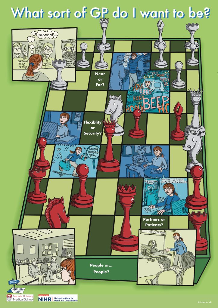 Here, Tony, the artist we have been working with, is drawing some of the challenges faced by general practitioners in particular. Our character, let’s call her Brooke, has known that she wanted to be a GP since medical school, but it turns out that there is a lot that she didn’t know about being a GP until she was faced with the choices. Some of the doctors we worked with in our study were committed to being a GP for the community, while others liked to have more separation between their personal and working lives. This might mean a long commute to work on a daily basis. But the alternative might be for you to see patients in the supermarket when you’re doing your weekly shop or at the school gates. The separation between work and home life is important, and doctors are not allowed to provide treatment for their friends – which is difficult if you all live in the same village.